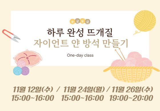 | 교육내용 | 몽글몽글 구름같이 폭신한 자이언트 얀 방석&가방, 직접 만들어 보세요! 바늘이나 뜨개 도구 없이 손가락만으로 쓱쓱, 초보자도 1시간이면 충분해요. ★기타 요청사항에 희망하는 날짜 적어주시기 바랍니다★ 자이언트얀 가방 11.12(수) 15:00~16:00 / 15명 자이언트얀 방석 11.24(월) 15:00~16:00 / 15명 자이언트얀 가방 11.26(수) 19:00~20:00 / 15명 |
