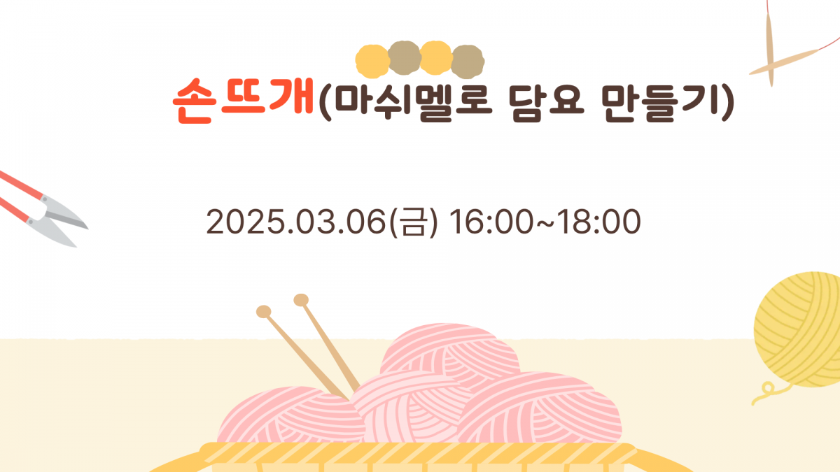 | 교육내용 | 세상에서 가장 부드러운 실로 나만의 온기를 짜 보세요! 올 겨울,당신의 소파 위가 더 포근해 집니다. 아이들은 난이도가 높아 진행이 어려울 수 있어 성인만 접수 받겠습니다. |