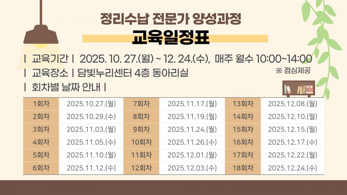 교육내용 | 공간의 가치를 되찾는 특별한 시작! 체계적인 정리 노하우와 실습으로 전문가로 성장할 기회를 잡아보세요. (교육기간 내 매주 월,수 10:00~14:00) |