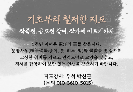 | 교육내용 | "기초부터 철저한 지도" 작품전, 공모전 참여, 작가에 이르기까지 5천년 이어온 東洋의 美를 찾읍시다. 문방사우(紙筆硯墨:종이, 붓, 벼루, 먹)와 墨香을 벗 삼으며 고상한 취미를 기르고 인격도야로 교양을 갖추고, 정서를 함양하여 보람 있는 인생을 찾으시기 바랍니다. 매주 월요일 저녁 6시 30분~9시 담빛누리센터 4층 동아리실 문의; 우석 박신근 010-3610-5015 |