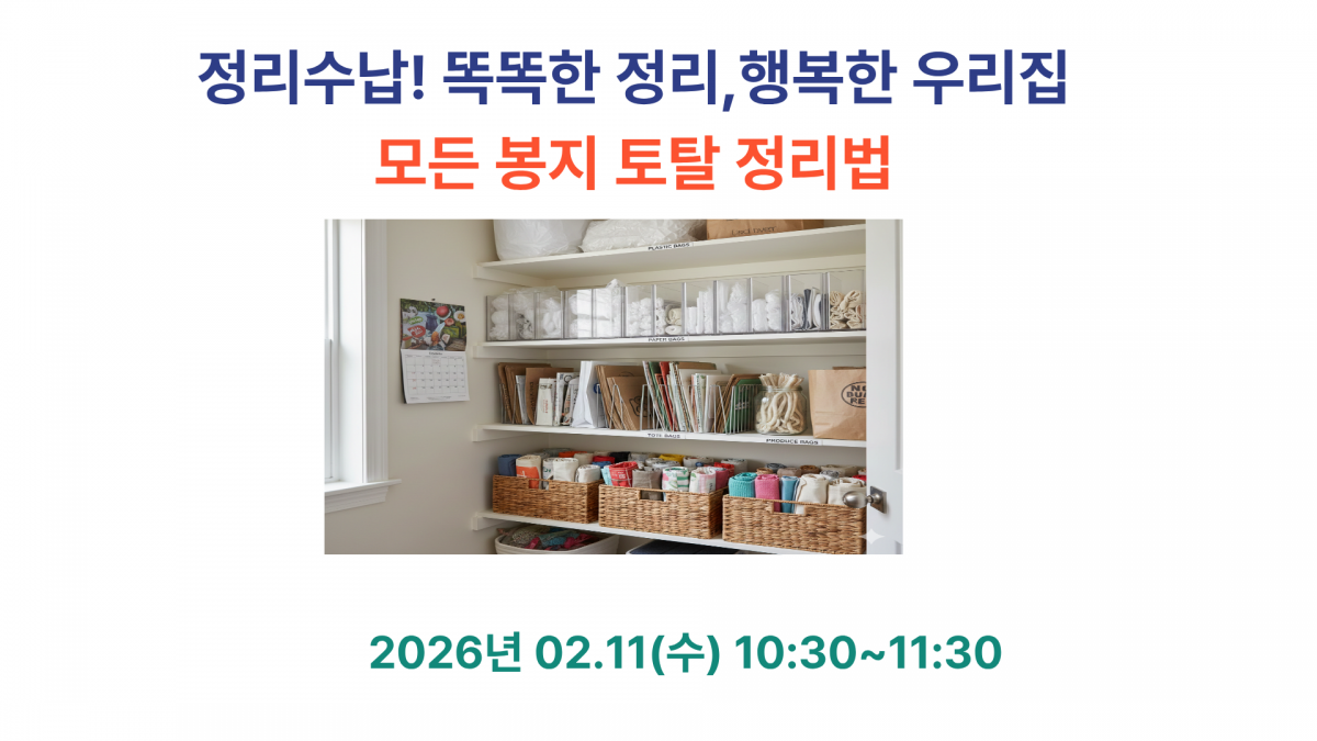 | 교육내용 | "모든봉지 토탈 정리법" 프로그램 참여자께서는 실습을 위해 가정에서 보관중인 봉지를 종류 구분없이 직접 가져와 주세요! |
