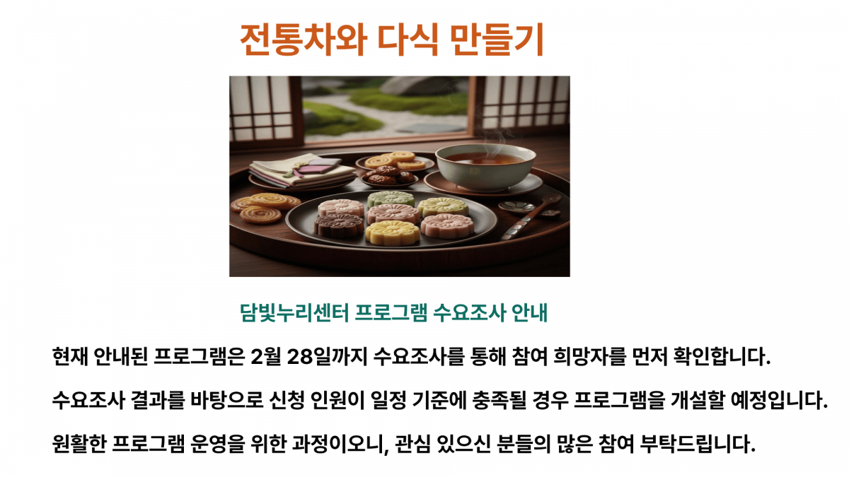 | 교육내용 | 우리의 전통의 멋과 여유를 느끼며 차와 다식을 직접 만들어보는 체험형 수업 입니다. 계절에 어울리는 전통차를 배우고 ,자연 재료를 활용한 다식을 만들어 보며 마음의 휴식과 힐링의 시간을 가질수 있어요 바쁜 일상속에서 전통의 향기와 함께 느긋한 시간을 즐겨보세요!!! |