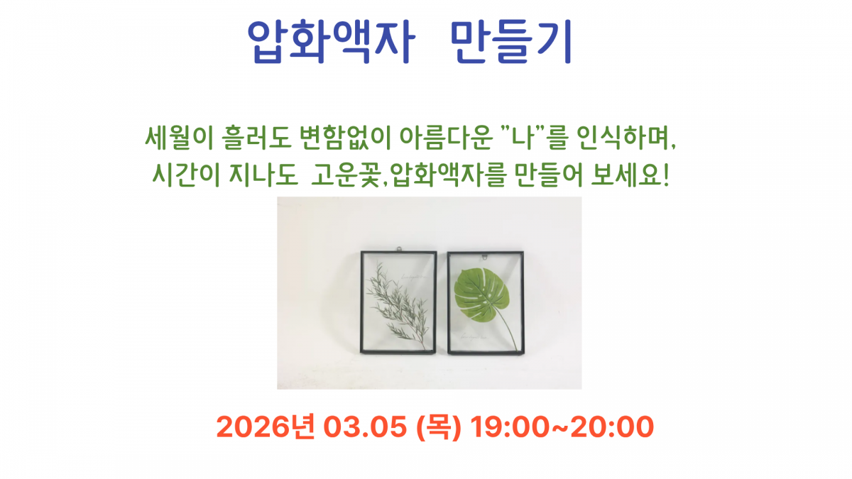 | 교육내용 | 세월이 흘러도 변함없이 아름다운 "나"를 인식하며 ,시간이 지나도 고운 꽃,압화액자를 만들어 보세요! |